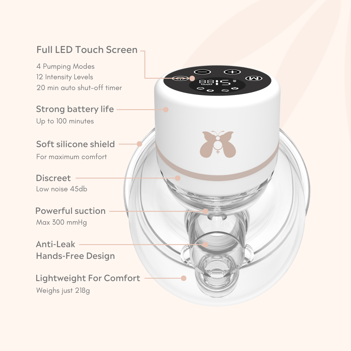 Our pump uses advanced air-pressure pulse technology that expresses milk but avoids irritation and discomfort. Much like the great mums who use it, it’s powerful and gentle at the same time, allowing you an efficient and comfortable pump every time. The USB rechargeable battery ensures up to 100 minutes pumping after a full charge. It's cordless and ridiculously portable!
