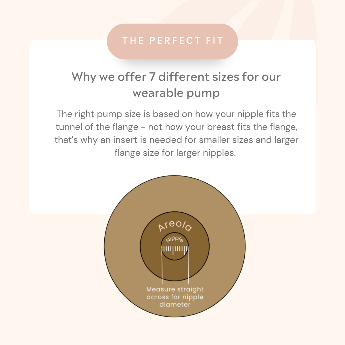 In order for your pump to fit perfectly, don't forget to measure your nipple diameter. If you are not the standard size (24mm) you will need to purchase the correct size insert or flange click here