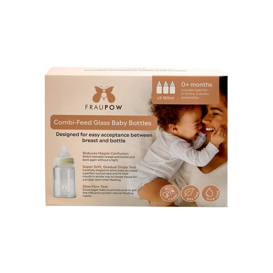 The Fraupow Combi-Feed Glass Baby Bottles are part of Fraupow's breastfeeding support system. The range includes an award winning hands free electric pump and a manual milk collector. Fraupows bottles, reusable breast pads and other feeding accessories provide everything you need to make pumping and feeding as hassle free as possible.